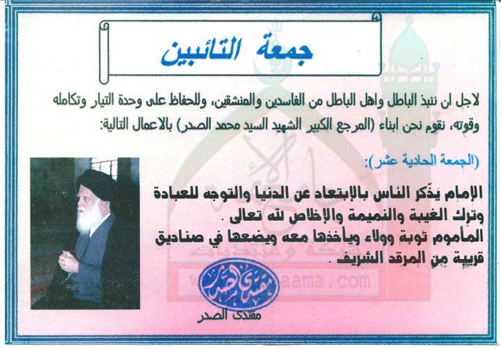 ليكن مسيرنا مسير ندم وحسرة على ما فرطنا في جنب الله ونطلب التوبة من الله ورسوله واهل البيت عليهم السلام والسيد الشهيد الصدر (قدس سره) والسيد القائد مقتدى الصدر (اعزه الله) وان نكون من المطيعين لقائدنا والمنفذين لأوامره حتى يرزقنا الله الشهادة تحت رايته