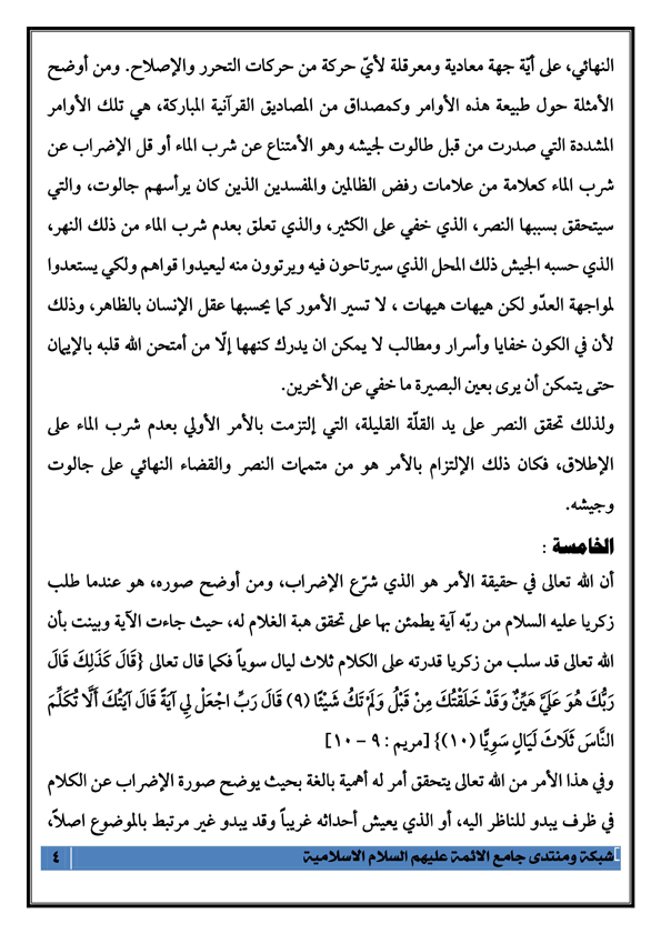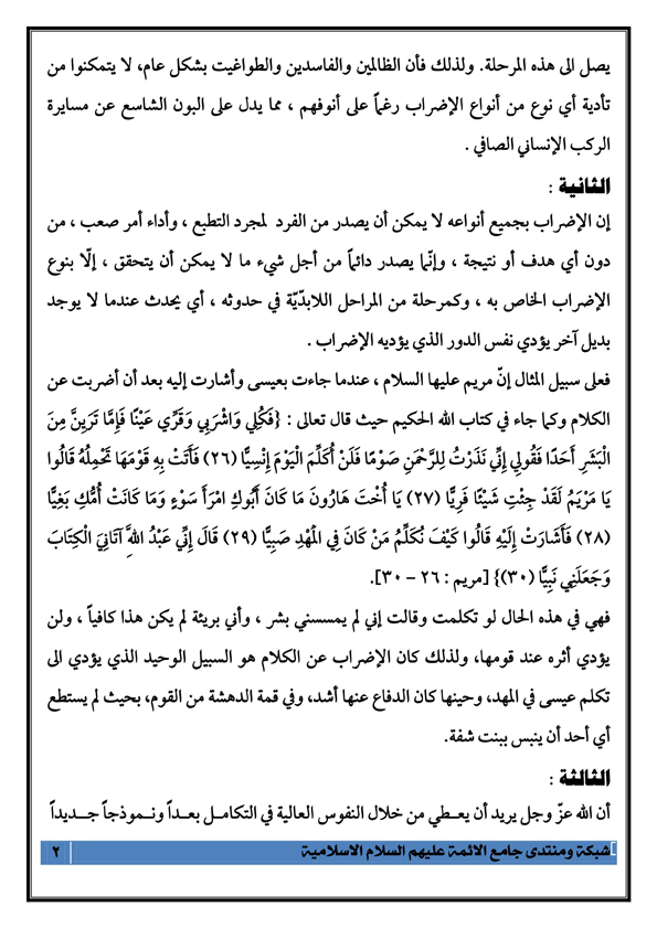 والحقيقة أن الأمر لا ينحصر بهذا الحجم من التفكير والإستنتاج فقط، وإنّما هناك عدّة نقاط يمكن الخروج بها من ذلك الأمر، الذي صدر من سماحة السيد مقتدى الصدر، نذكر منها ما يلي: الأولى : أنّ مسألة الإضراب عن شيءٍ ما، هي من الأمور العرفية التي يأنس بها الأنبياء والمصلحون، وكلُّ من جُبِلَ على الطبع الإنساني الخالص. إذن فهي مسألة تكميلية للفرد الإنساني في رقيّه وكماله، يتحرك من خلاله لتأدية دوره في هذا الجانب، متى ما حضرت وكملت مقدماته وعلّله التي تحرك ظهوره على السطح. ولذلك تجد مـن لم يوفق لهضم مطالـب الإنسانية ومـــراحل نموها في المجتمعات، لا يمكن له أن يصل الى هذه المرحلة. ولذلك فأن الظالمين والفاسدين والطواغيت بشكل عام، لا يتمكنوا من تأدية أي نوع من أنواع الإضراب رغماً على أنوفهم ، مما يدل على البون الشاسع عن مسايرة الركب الإنساني الصافي . الثانية : إن الإضراب بجميع أنواعه لا يمكن أن يصدر من الفرد لمجرد التطبع ، وأداء أمر صعب ، من دون أي هدف أو نتيجة ، وإنّما يصدر دائماً من أجل شيء ما لا يمكن أن يتحقق ، إلّا بنوع الإضراب الخاص به ، وكمرحلة من المراحل اللابدّيّة في حدوثه ، أي يحدث عندما لا يوجد بديل آخر يؤدي نفس الدور الذي يؤديه الإضراب . فعلى سبيل المثال إنّ مريم عليها السلام ، عندما جاءت بعيسى وأشارت إليه بعد أن أضربت عن الكلام وكما جاء في كتاب الله الحكيم حيث قال تعالى : {فَكُلِي وَاشْرَبِي وَقَرِّي عَيْنًا فَإِمَّا تَرَيِنَّ مِنَ الْبَشَرِ أَحَدًا فَقُولِي إِنِّي نَذَرْتُ لِلرَّحْمَنِ صَوْمًا فَلَنْ أُكَلِّمَ الْيَوْمَ إِنْسِيًّا (26) فَأَتَتْ بِهِ قَوْمَهَا تَحْمِلُهُ قَالُوا يَا مَرْيَمُ لَقَدْ جِئْتِ شَيْئًا فَرِيًّا (27) يَا أُخْتَ هَارُونَ مَا كَانَ أَبُوكِ امْرَأَ سَوْءٍ وَمَا كَانَتْ أُمُّكِ بَغِيًّا (28) فَأَشَارَتْ إِلَيْهِ قَالُوا كَيْفَ نُكَلِّمُ مَنْ كَانَ فِي الْمَهْدِ صَبِيًّا (29) قَالَ إِنِّي عَبْدُ اللَّهِ آتَانِيَ الْكِتَابَ وَجَعَلَنِي نَبِيًّا (30)} [مريم : 26 - 30]. فهي في هذه الحال لو تكلمت وقالت إني لم يمسسني بشر ، وأني بريئة لم يكن هذا كافياً ، ولن يؤدي أثره عند قومها، ولذلك كان الإضراب عن الكلام هو السبيل الوحيد الذي يؤدي الى تكلم عيسى في المهد، وحينها كان الدفاع عنها أشد، وفي قمة الدهشة من القوم، بحيث لم يستطع أي أحد أن ينبس ببنت شفة. الثالثة : أن الله عزّ وجل يريد أن يعــطي من خلال النفوس العالية في التكامــل بعــداً ونــموذجاً جـــديداً لمواجهة الظالم والطاغوت، هذا النموذج لا يمكن له ان يتحكم به ويمنع المظلوم عن أدائه، فقد يكون الظالم والفاسد ذا قوة وسطوّة عالية يسلب فيها من المظلوم كل الأدوات المادية في جو الخارج، التي يشعر الظالم بانها وسيلة من الممكن أن يتم فيها القضاء عليه. ولكن الله تعالى قد منح الإنسان قوى متعددة من الممكن أن يستعيض بأيٍّ منها ويجعلها محلّ القوّة التي كانت بالأصل هي المعنية بالأمر دون الأخرى. فالإضراب عن الطعام هو أحد القوى البديلة عن مواجهة الظالم الفاسد بالطرق المادية المباشرة، وحتى لا يتم القضاء النهائي على قوى الرفض، زوّد الانسان بقوّة لا يمكن للظالم سلبها منه بأيّ حال من الأحوال . وهذا بطبعه يمثل إظهار أحد النعم الإلهية التي تكون ملازمة للإنسان في أشد ساعات المحنة والإحتياج، مما يدّل على وجود عدّة بدائل ووسائل تعين الإنسان في حالة فقد المسببات والعلل المادية في إيجادها. الرابعة : نحن مرتبطون بموضوع لا يمكن ان يُغَضّ الطرف عنه أو تجاهله، ألا وهو موضوع الإرتباط بالإمام المهدي عليه السلام. هذا الأمر يتطلب من الفرد المُنتَظِر أن يمرّ بمراحل من التربية والبلاءات بحيث يدخل الفرد فيها حيز التمحيص الذي يمدّه بعناصر تكون له خير معين في تحمل ما يصدر من الامام عليه السلام من أوامر تكون ثقيلة، وفي الأعمّ الأغلب غير معتادة، ومن أهم العناصر التي يجب على الفرد المنتظر أن يتجلبب بها هو عنصر التحمّل والصبر في الظروف القاسي