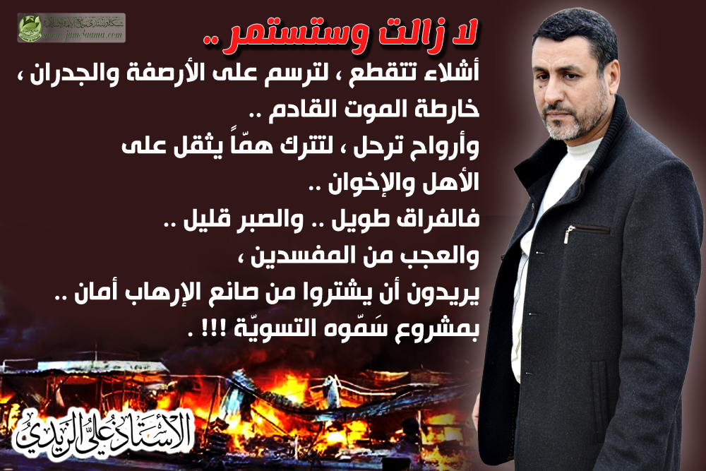 لا زالت وستستمر ... أشلاء تتقطع ، لترسم على الأرصفة والجدران ، خارطة الموت القادم .. وأرواح ترحل ، لتترك همّاً يثقل على الأهل والإخوان .. فالفراق طويل .. والصبر قليل .. والعجب من المفسدين ، يريدون أن يشتروا من صانع الإرهاب أمان .. بمشروع سَمّوه التسويّة !!! . الاستاذ الفاضل علي الزيدي ــــــــــــــــــــــــــــــــــــــــــــــــــ ــــhttp://www.jam3aama.com/up/do.php?img=8832 |