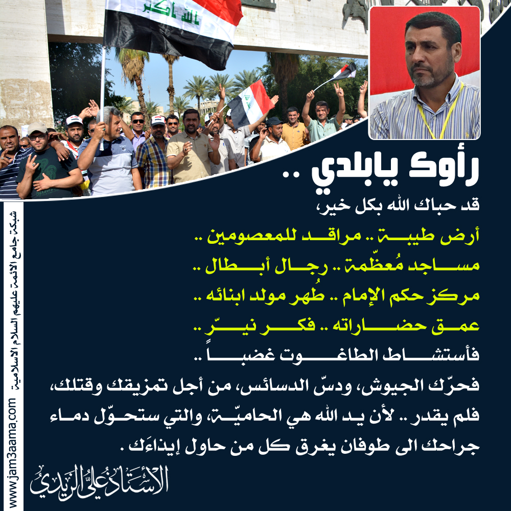رأوك يابلدي .. قد حباك الله بكل خير، أرض طيبة .. مراقد للمعصومين .. مساجد مُعظّمة .. رجال أبطال .. مركز حكم الإمام .. طُهر مولد ابنائه .. عمق حضاراته .. فكر نيّر .. فأستشاط الطاغوت غضباً .. فحرّك الجيوش، ودسّ الدسائس، من أجل تمزيقك وقتلك، فلم يقدر .. لأن يد الله هي الحاميّة، والتي ستحوّل دماء جراحك الى طوفان يغرق كل من حاول إيذاءَك . الاستاذ علي الزيدي ــــــــــــــــــــــــــــــــــــــــــــــــــ ـــــــــــــــــــــــــــ http://www.jam3aama.com/up/do.php?img=7744 |