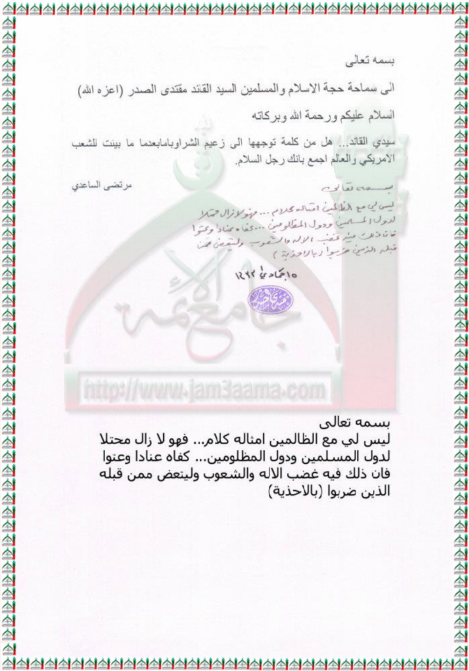 كلمة موجهة الى زعيم الشر اوباما استفتاء السيد القائد مقتدى الصدر اعزه الله 9- 4 - 2012