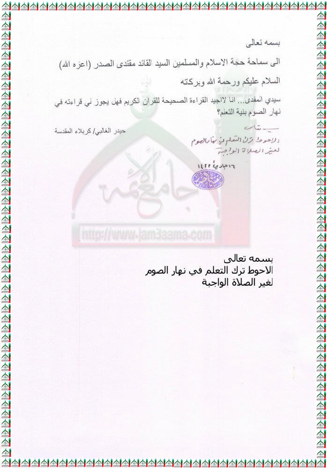 الاحوط ترك تعلم قراءة القران في نهار الصوم لمن لا يجيد القراءة الصحيحة له استفتاء السيد القائد مقتدى الصدر اعزه الله 10 - 4 - 2012