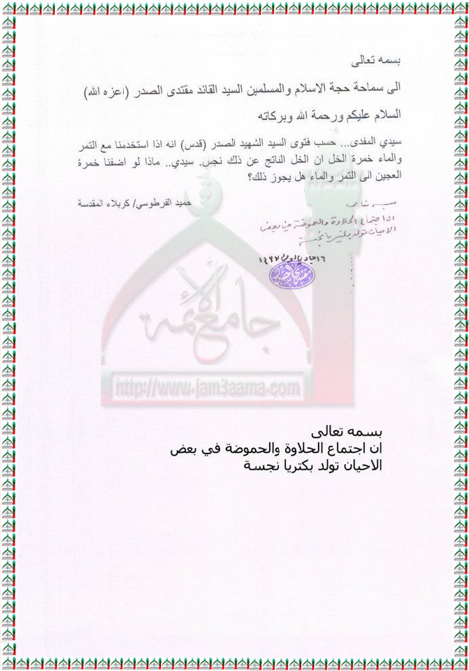 اضافة خمرة العجين الى التمر والماء استفتاء السيد القائد مقتدى الصدر اعزه الله 10 - 4 - 2012