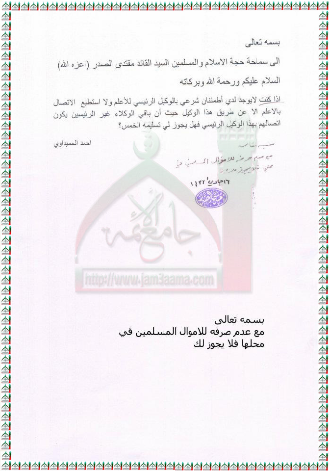 تسليم الخمس مع عدم وجود الاطمئنان الشرعي بوكيل الاعلم استفتاء السيد القائد مقتدى الصدر اعزه الله 10 - 4 - 2012