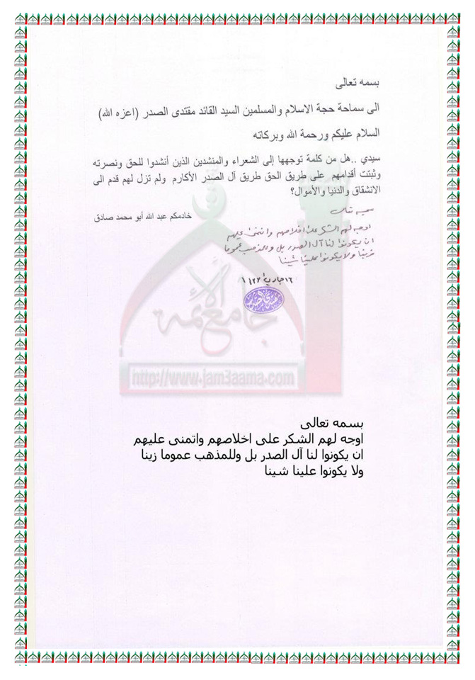 كلمة الى الشعراء والمنشدين الذين ثبتت اقدامهم على طريق الحق ولم تزل قدمهم الى الانشقاق والدنيا والاموال استفتاء السيد القائد مقتدى الصدر اعزه الله 10 - 4 - 2012