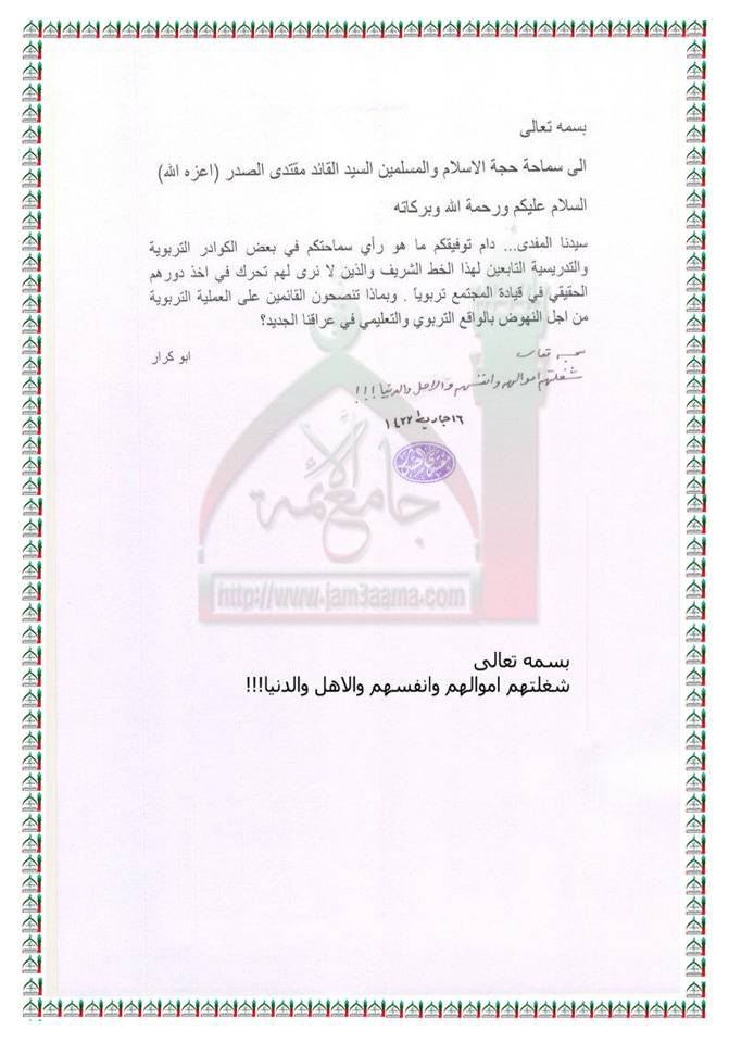 تقصير بعض كوادر التيار التربوية والتدريسية في قيادة المجتمع تربويا استفتاء السيد القائد مقتدى الصدر اعزه الله 10 - 4 - 2012
