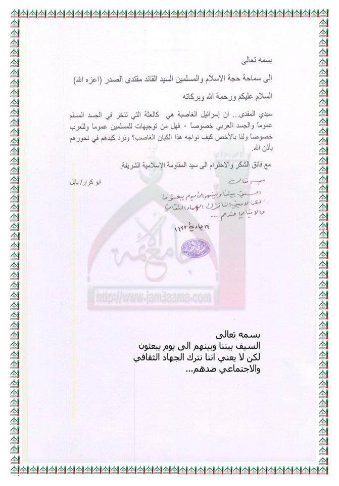كيفية مواجهة اللقيطة اسرائيل من قبل المسلمين استفتاء السيد القائد مقتدى الصدر اعزه الله 10 - 4 - 2012