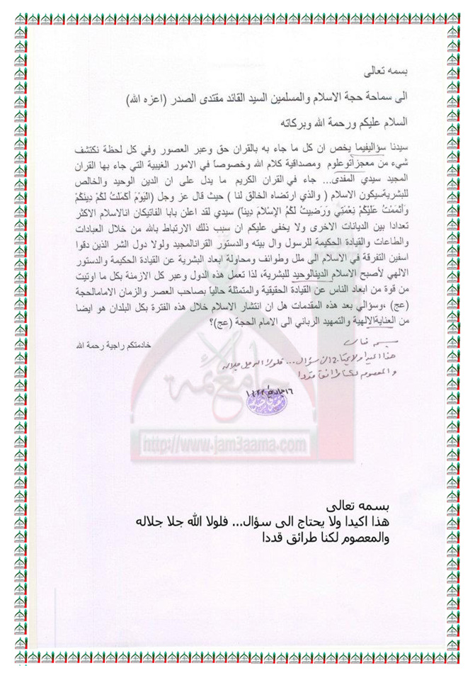 انتشار الاسلام بكل البلدان من العناية الالهية والتمهيد الرباني للامام المهدي عليه السلام استفتاء السيد القائد مقتدى الصدر اعزه الله 10 - 4 - 2012