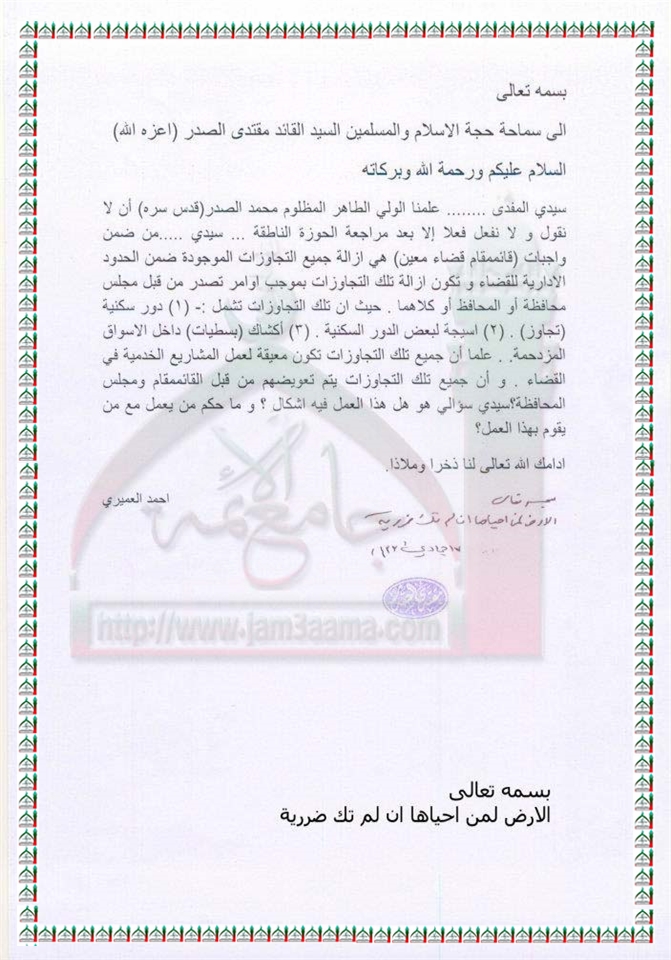 التعامل مع المتجاوزين على الاراضي العامة استفتاء السيد القائد مقتدى الصدر اعزه الله 11- 4 - 2012
