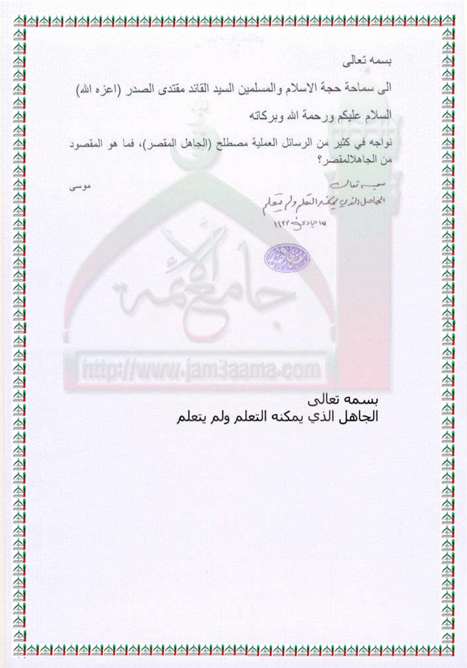 المقصود بمصطلح الجاهل المقصر الوارد في الرسائل العملية استفتاء السيد القائد مقتدى الصدر اعزه الله 11- 4 - 2012