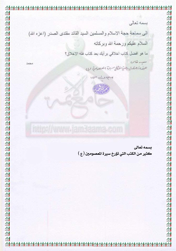 افضل كتاب اخلاقي بعد كتاب فقه الاخلاق استفتاء السيد القائد مقتدى الصدر اعزه الله 11- 4 - 2012