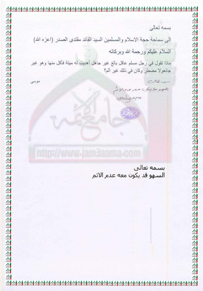السهو قد يكون معه عدم الاثم استفتاء السيد القائد مقتدى الصدر اعزه الله 11- 4 - 2012