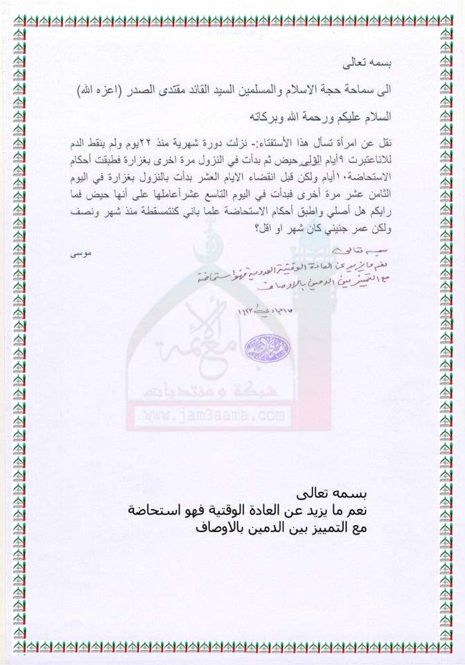 ما يزيد عن العادة الوقتية فهو استحاضة مع التمييز بين الدمين بالاوصاف استفتاء السيد القائد مقتدى الصدر اعزه الله 11- 4 - 2012
