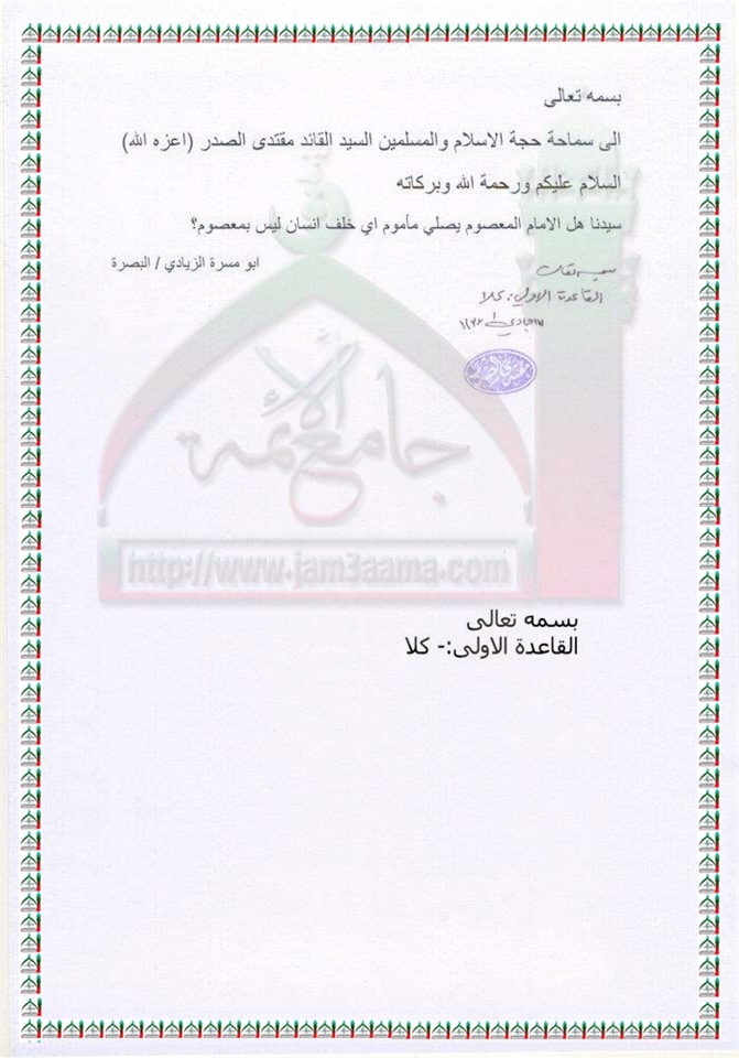 الامام المعصوم لايصلّي الا خلف امام معصوم استفتاء السيد القائد مقتدى الصدر اعزه الله 11- 4 - 2012
