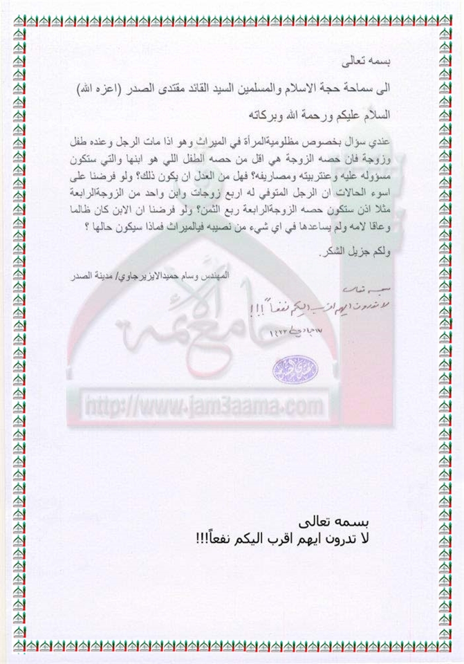 الحكمة الالهية في تحديد المواريث استفتاء السيد القائد مقتدى الصدر اعزه الله 11- 4 - 2012