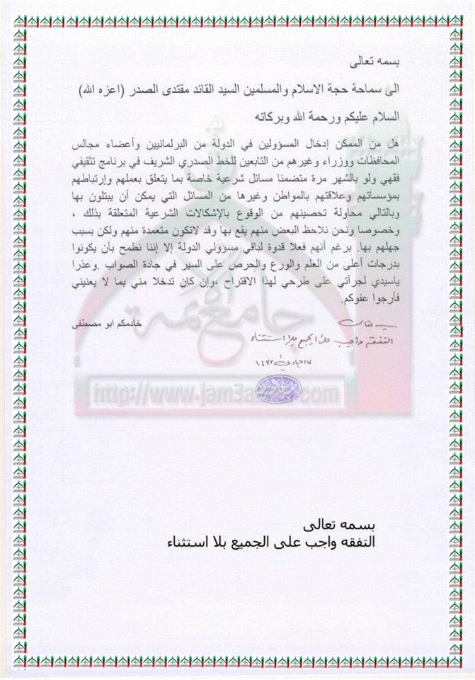 وجوبية التفقه على مسؤلي التيار من برلمانيين واعضاء مجالس المحافظات والوزراء بلا استثناء استفتاء السيد القائد مقتدى الصدر اعزه الله 11- 4 - 2012