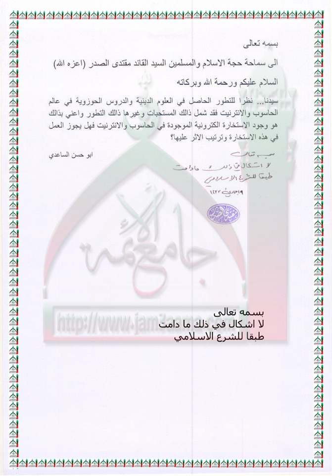 حكم الاستخارة الالكترونية استفتاء السيد القائد مقتدى الصدر اعزه الله 12 - 4 - 2012