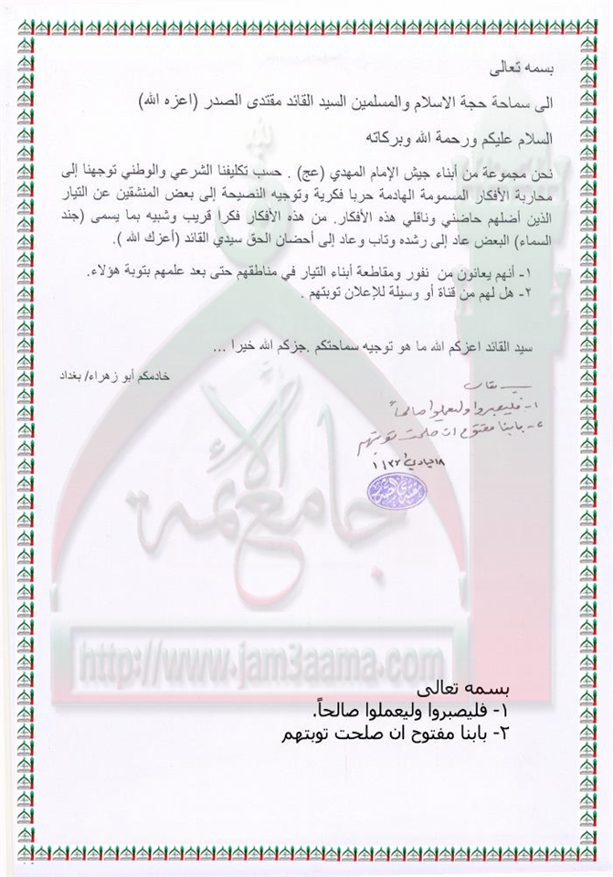 توبة بعض اصحاب الافكار الضالة استفتاء السيد القائد مقتدى الصدر اعزه الله 12 - 4 - 2012