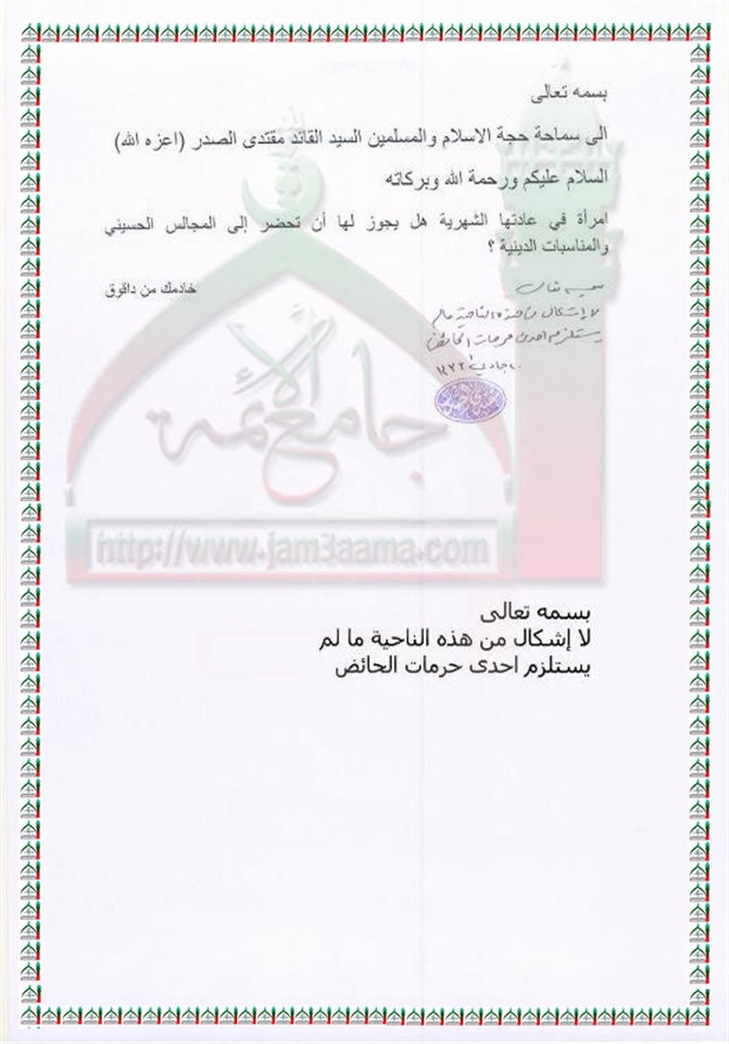 جواز حضور الحائض المجالس الحسينية استفتاء السيد القائد مقتدى الصدر اعزه الله 13 -4 -2012