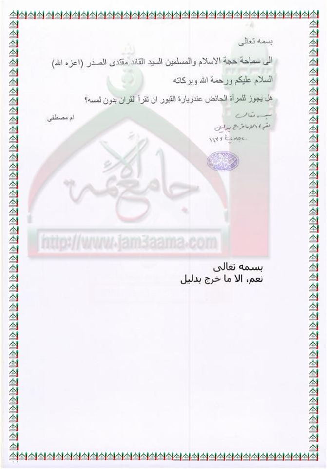 قراءة الحائض للقران الكريم استفتاء السيد القائد مقتدى الصدر اعزه الله 13 -4 -2012