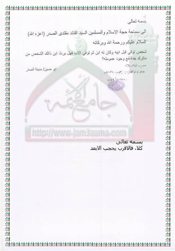 مسألة في الارث استفتاء السيد القائد مقتدى الصدر اعزه الله 13 -4 -2012
