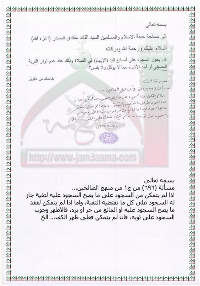 كيفية السجود في حال فقدان ما يصح السجود عليه استفتاء السيد القائد مقتدى الصدر اعزه الله 14 -4 -2012