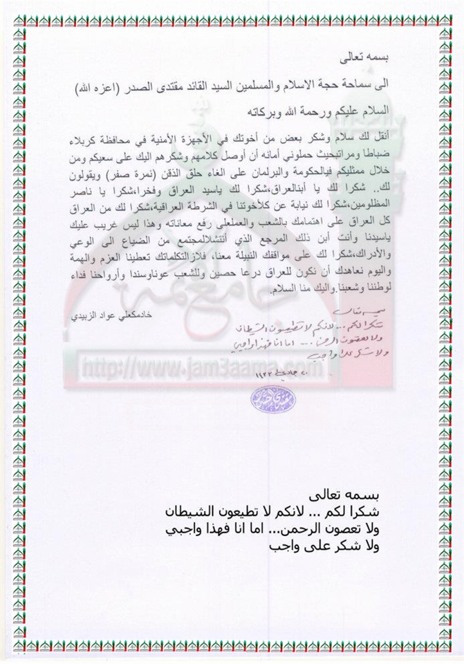 شكر الاجهزة الامنية في محافظة كربلاء لسماحته على الغاء قانون حلق الذقن ( نمرة صفر ) استفتاء السيد القائد مقتدى الصدر اعزه الله 14 - 4 - 2012