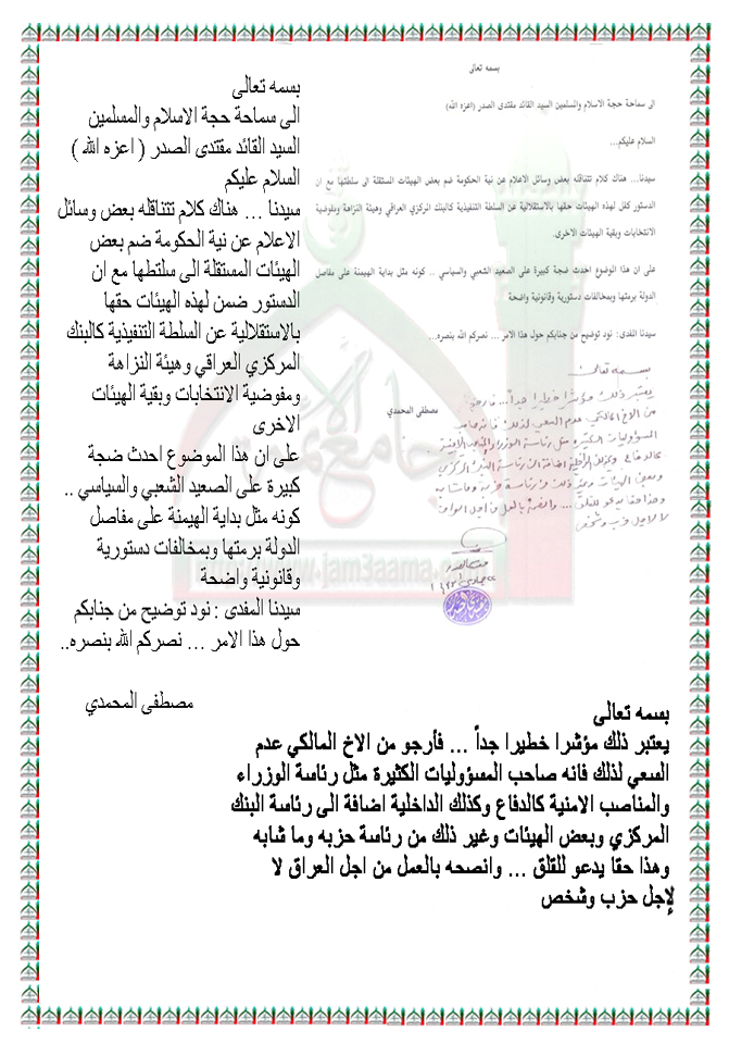 تفرد المالكي بالسلطة استفتاء السيد القائد مقتدى الصدر اعزه الله 14 - 4 - 2012