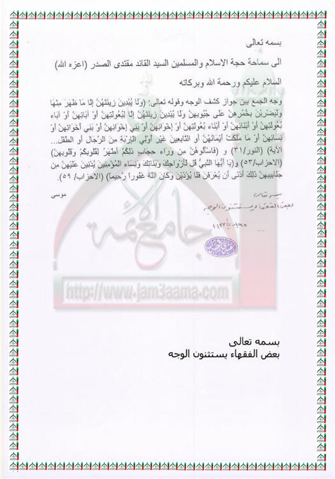 وجه الجمع بين جواز كشف الوجه والاية 31 من سورة النور و53و59 من الاحزاب استفتاء السيد القائد مقتدى الصدر اعزه الله 15 - 4 - 2012