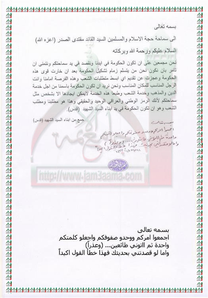 تشكيل الحكومة المقبلة ورغبة البعض في ان يكون سماحته رئيسها استفتاء السيد القائد مقتدى الصدر اعزه الله 15 - 4 - 2012