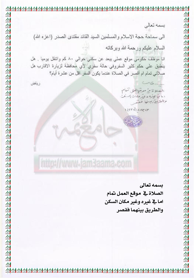 حالة من حكم صلاة المسافر استفتاء السيد القائد مقتدى الصدر اعزه الله 16 - 4 - 2012