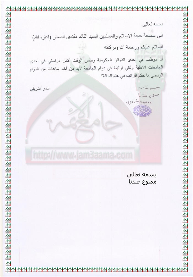 حكم الراتب المأخوذ من قبل الموظف والذي يستقطع ساعات من الدوام الرسمي من اجل الدراسة في الجامعات الاهلية استفتاء السيد القائد مقتدى الصدر اعزه الله 19 - 4 - 2012