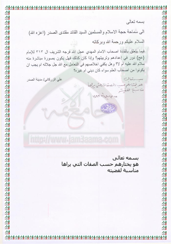 دور الامام المهدي عج في تربية واعداد اصحابه الـــ 313 استفتاء السيد القائد مقتدى الصدر اعزه الله 19 - 4 - 2012