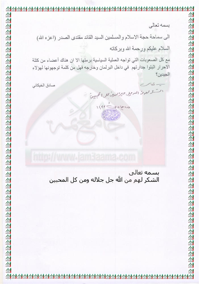 كلمة شكر لبعض اعضاء كتلة الاحرار الذين اثبتوا جدارتهم في داخل البرلمان وخارجه استفتاء السيد القائد مقتدى الصدر اعزه الله 19 - 4 - 2012