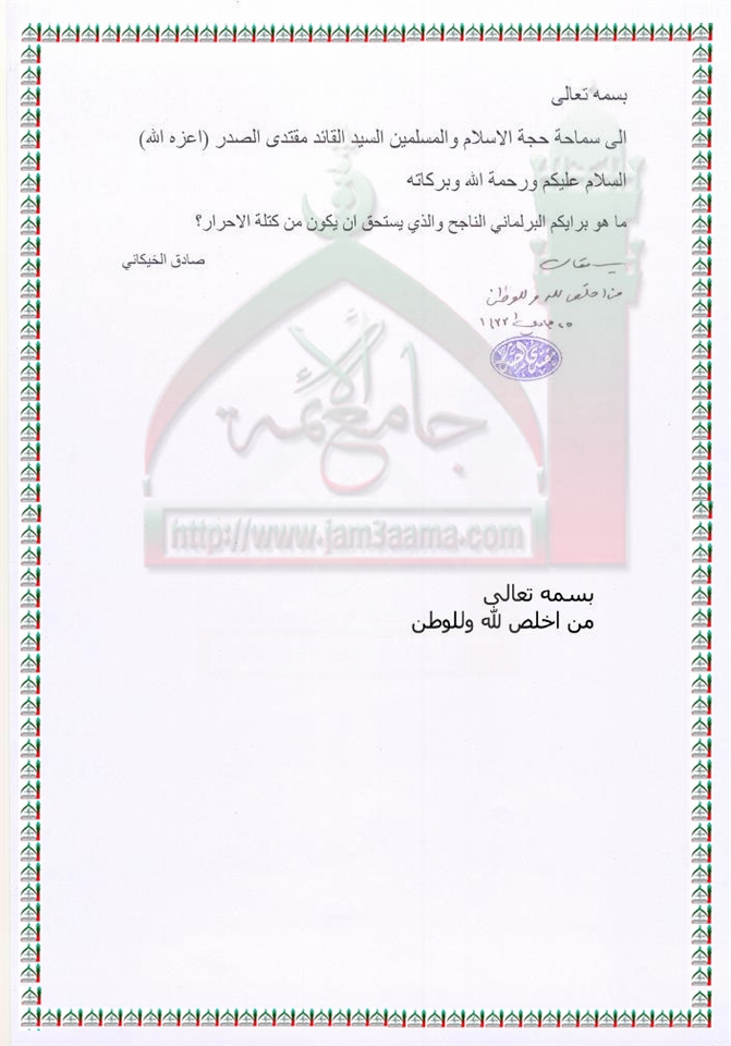 من اخلص لله والوطن هو البرلماني الناجح استفتاء السيد القائد مقتدى الصدر اعزه الله 19 - 4 - 2012