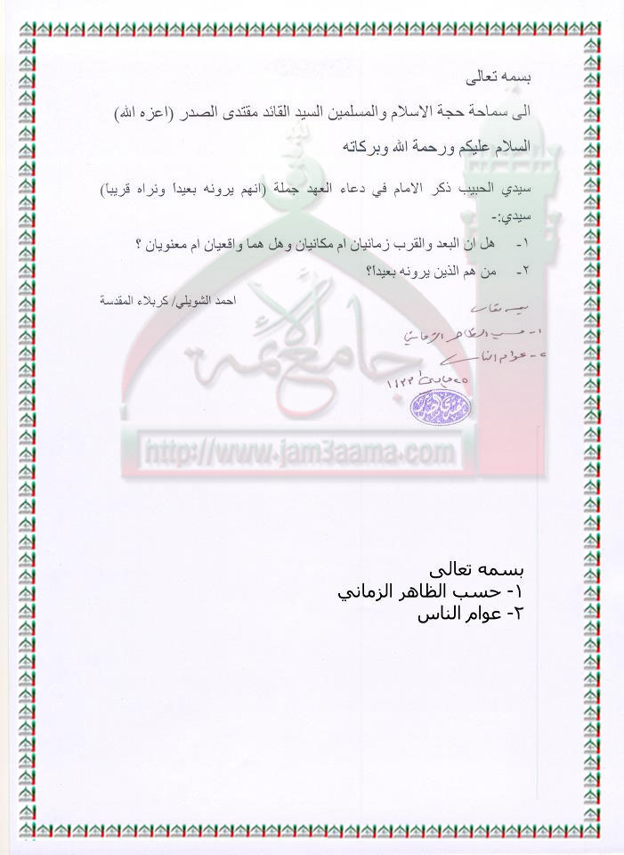 معنى قول الامام في دعاء العهد ( انهم يرونه بعيدا ونراه قريبا ) استفتاء السيد القائد مقتدى الصدر اعزه الله 19 - 4 - 2012