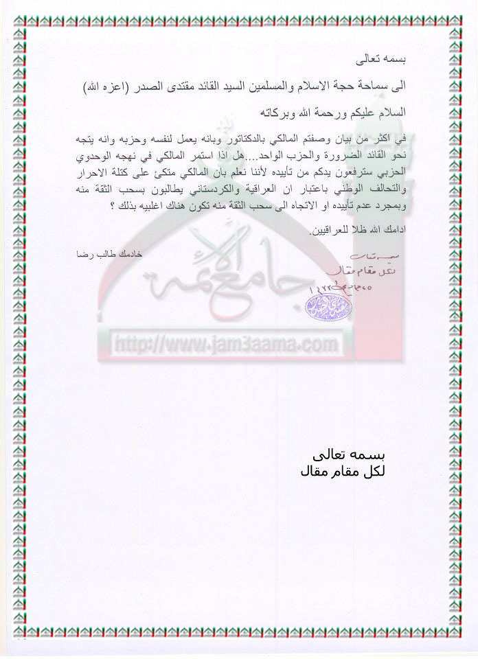 سحب الثقة عن المالكي في حال استمرار نهجه الوحدوي الحزبي استفتاء السيد القائد مقتدى الصدر اعزه الله 19 - 4 - 2012