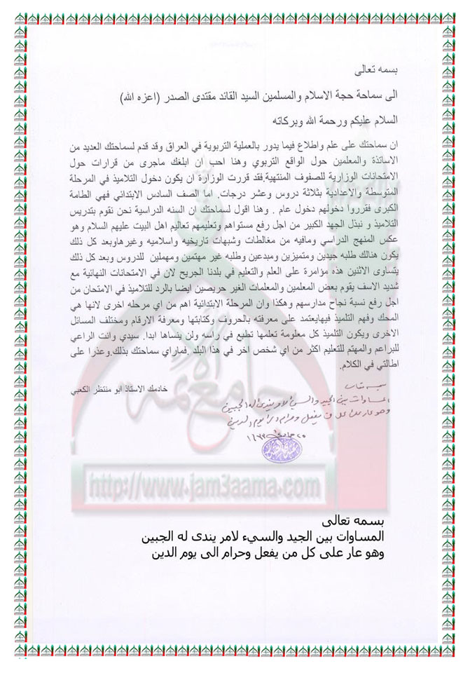 العملية التربوية والمساواة بين الطالب الجيد والسيء استفتاء السيد القائد مقتدى الصدر اعزه الله 19 - 4 - 2012