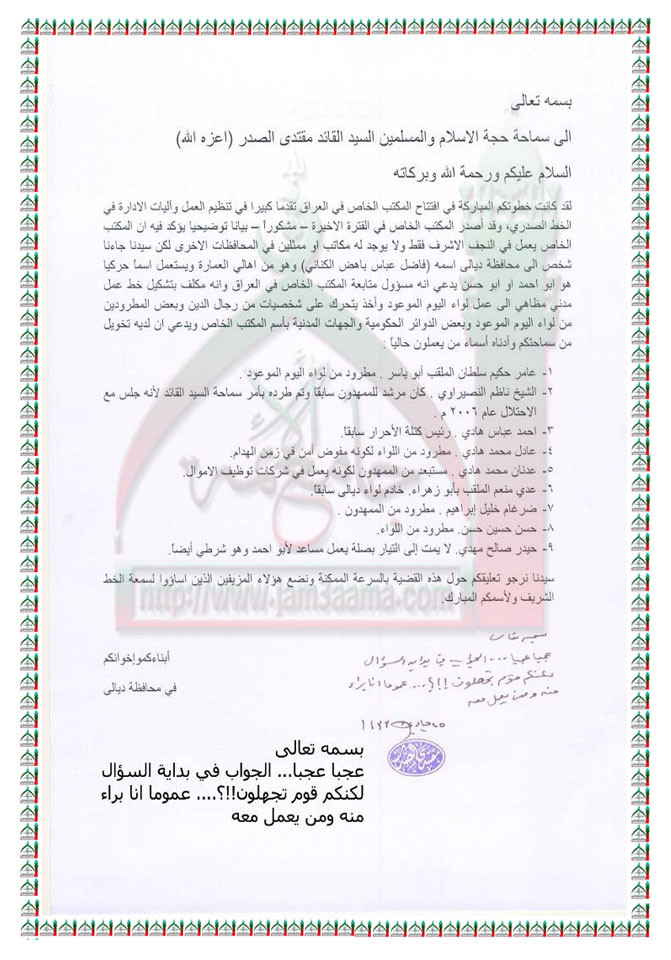 المدعو فاضل عباس باهض الكناني وادعاءه بانه مسؤول متابعة المكتب الخاص في العراق استفتاء السيد القائد مقتدى الصدر اعزه الله 19 - 4 - 2012
