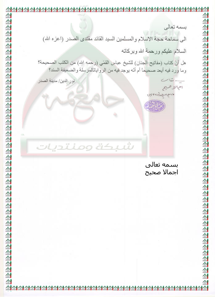 كتاب مفاتيح الجنان وكونه من الكتب الصحيحة استفتاء السيد القائد مقتدى الصدر اعزه الله 20 - 4 - 2012