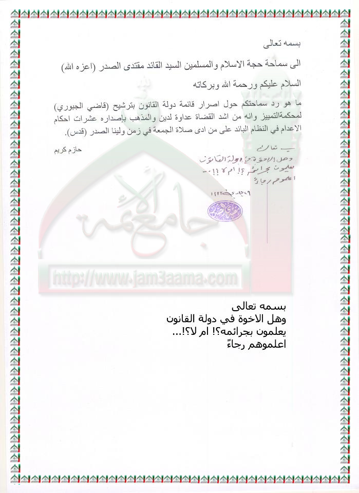 ترشيح دولة القانون للمجرم "قاضي الجبوري"لرئاسة محكمة التمييز استفتاء السيد القائد مقتدى الصدر اعزه الله 21 - 4 - 2012