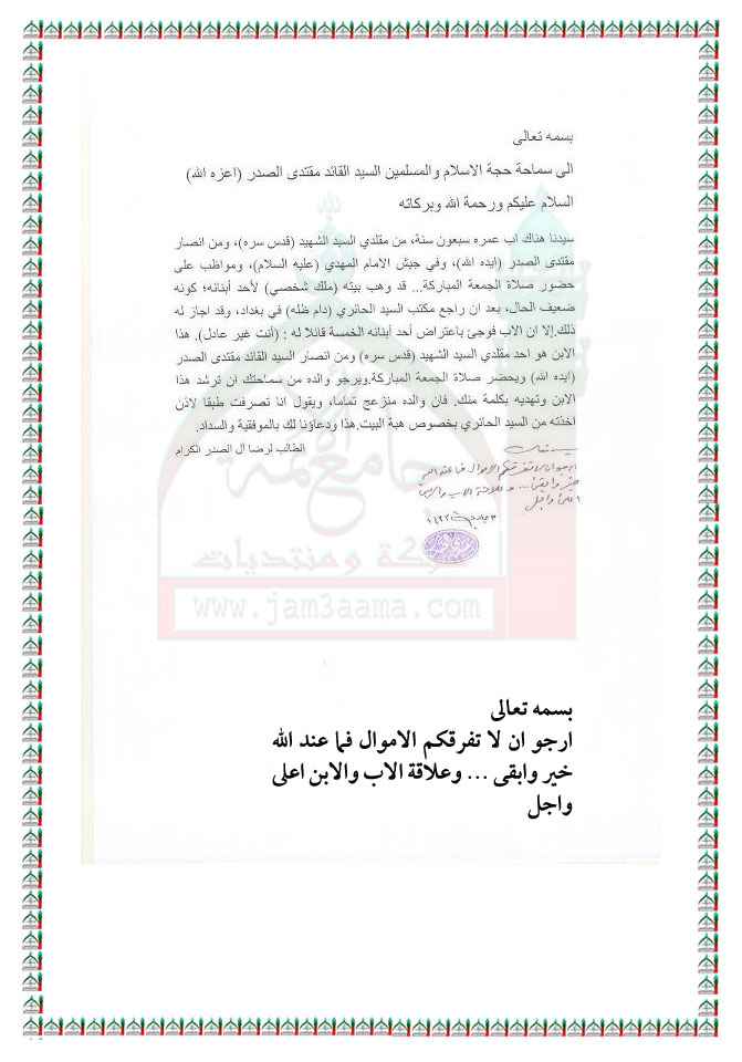 اب يعطي بيته هبة لاحد اولاده استفتاء السيد القائد مقتدى الصدر اعزه الله 26 - 4 - 2012