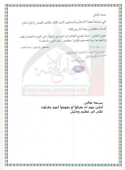 نصيحة للراغبين لدخول الحوزة الدينية استفتاء السيد القائد مقتدى الصدر اعزه الله 26 - 4 - 2012
