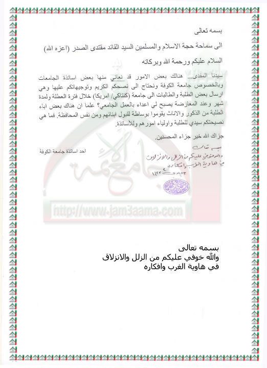 ارسال بعض الجامعات طلبتها الى الجامعات الامريكية خلال فترة العطلة استفتاء السيد القائد مقتدى الصدر اعزه الله 26 - 4 - 2012