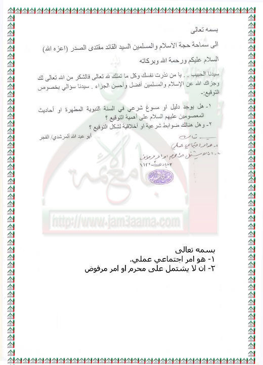 الضابط والمسوغ الشرعي للتوقيع استفتاء السيد القائد مقتدى الصدر اعزه الله 26 - 4 - 2012