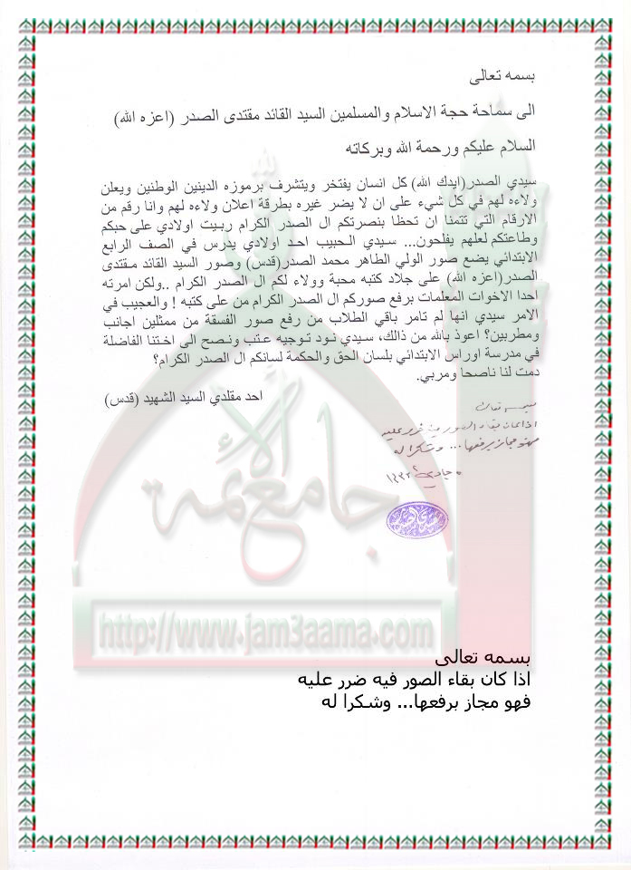 وضع صور ال الصدر على اغلفة الكتب من قبل احد الطلاب الاكاديميين استفتاء السيد القائد اعزه الله 27-4-2012
