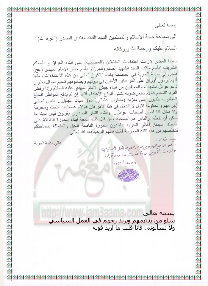 استمرارية الاعتداءات من قبل المصائب باسم المكتب الشريف استفتاء السيد القائد مقتدى الصدر 27-4-2012
