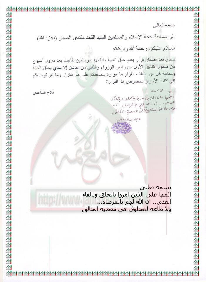 رجوع الحكومة الى قرار حلق اللحية بعد الغائه استفتاء السيد القائد مقتدى الصدر اعزه الله 27-4-2012
