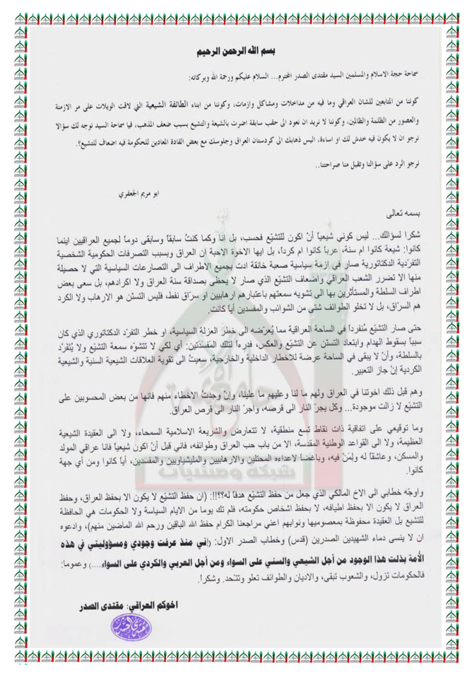 ادعاء البعض ان زيارة السيد مقتدى الصدر لاقليم كردستان فيها اضعاف للتشيع استفتاء السيد القائد مقتدى الصدر 4-5-2012