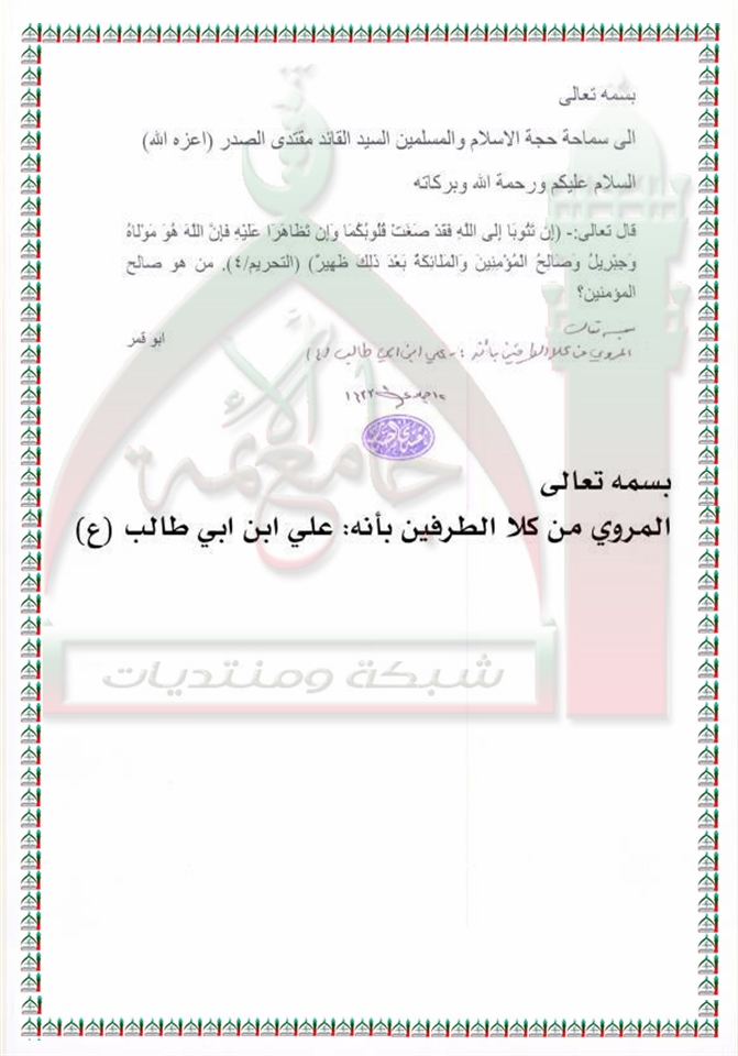 المقصود ب صالح المؤمنين في الاية "ان تتوبا الى الله فقد صغت قلوبكما ...." استفتاء السيد القائد مقتدى الصدر اعزه الله 5 - 5 - 2012